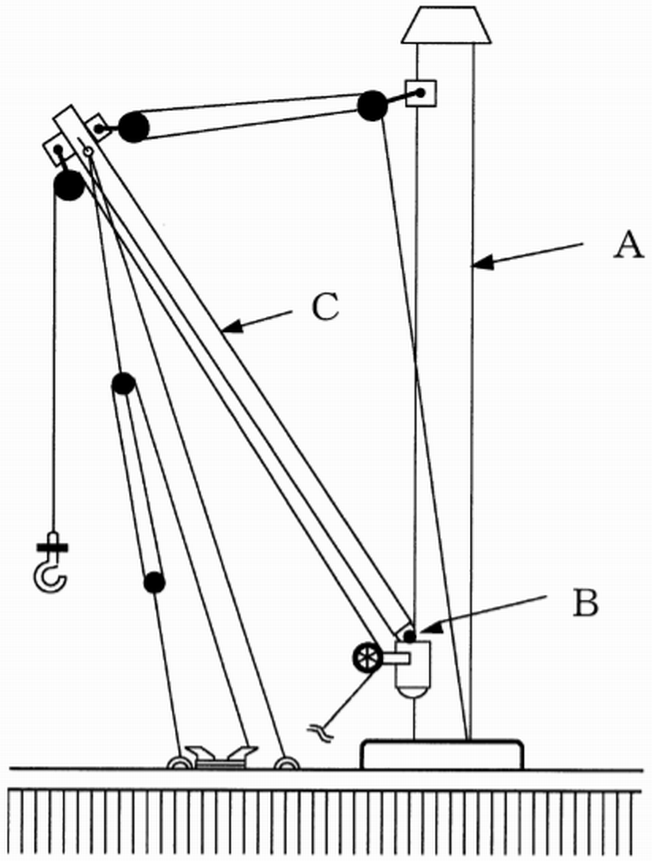 図はデリック型式の揚貨装置であるが、 AからCまでの名称の組合せとして、正しいものは(1)~(5)のうちどれか。